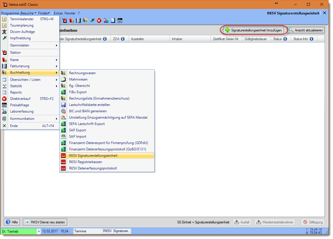 Gehen Sie bitte über "Programme --> Buchhaltung" zum Programmteil "RKSV Signaturerstellungseinheit". Dort klicken Sie bitte auf den Button "Signaturerstellungseinheit hinzufügen".