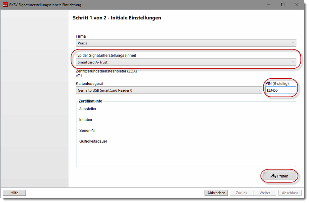 Als Kartenlesegerät wird Ihnen der "Gemalto USB SmartCard Reader 0" angeboten, der an Ihrem Datenbankserver bzw. Hauptrechner angeschlossen ist. Müssen Sie aufgrund unterschiedlicher Firmen mehrere Signaturerstellungseinheiten verwenden, wird Ihnen zusätzlich zum "Gemalto USB SmartCard Reader 0" auch der "Gemalto USB SmartCard Reader 1" etc. angeboten. Die 6-stellige PIN für die Signaturerstellungseinheit erhalten Sie von Ihrem Zertifizierungsanbieter zusammen mit dem Kartenlesegerät und der Signaturkarte. Nachdem Sie Ihre Daten vollständig erfasst haben, klicken Sie bitte auf den Button "Prüfen", damit die Kombination Ihrer Informationen auf Richtigkeit überprüft wird.