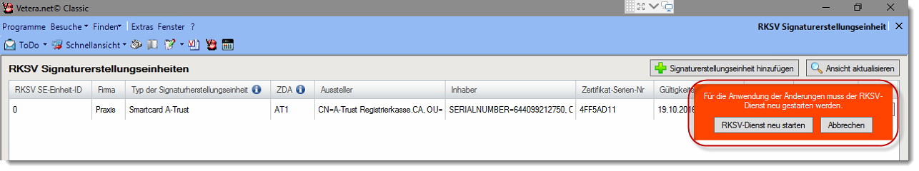 Um fortan mit Ihrer nun registrierten Signaturerstellungseinheit in VETERA.net arbeiten zu können, muss der RKSV-Dienst neu gestartet werden. Bitte bestätigen Sie den Neustart.
