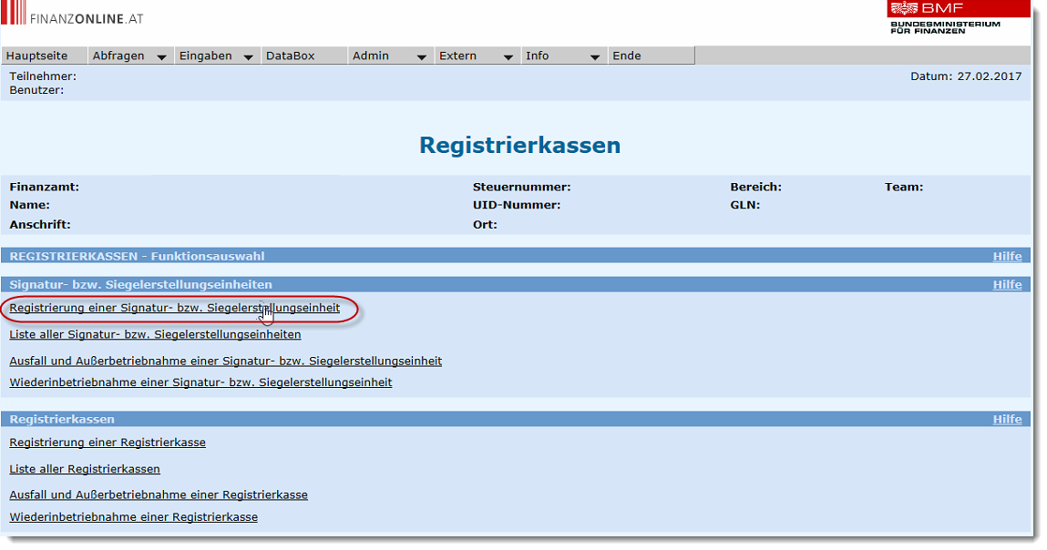 Navigieren Sie bitte von der Hauptseite aus über "Eingaben-->Registrierkassen" zur Seite "Registrierkassen".