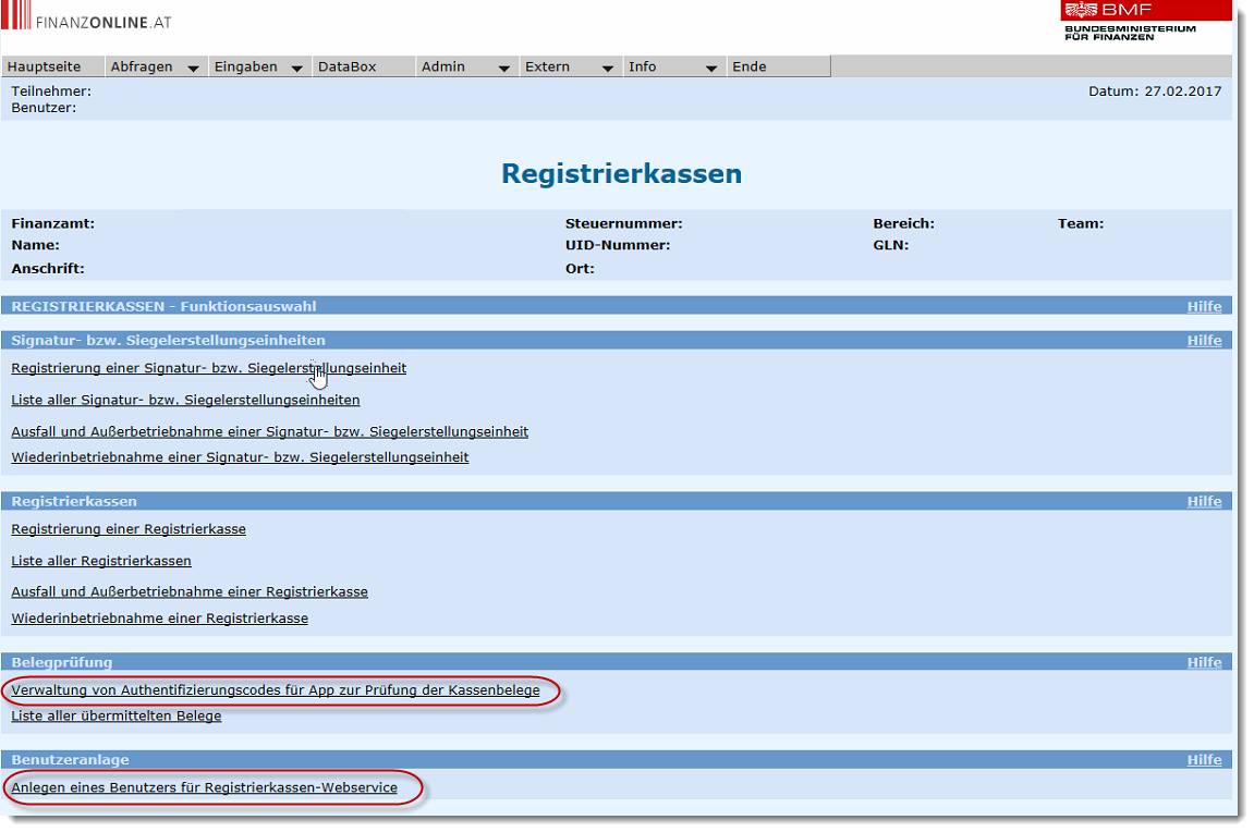 Navigieren Sie bitte von der Hauptseite aus über "Eingaben-->Registrierkassen" zur Seite "Registrierkassen".
