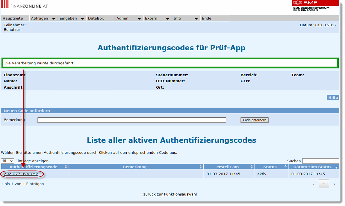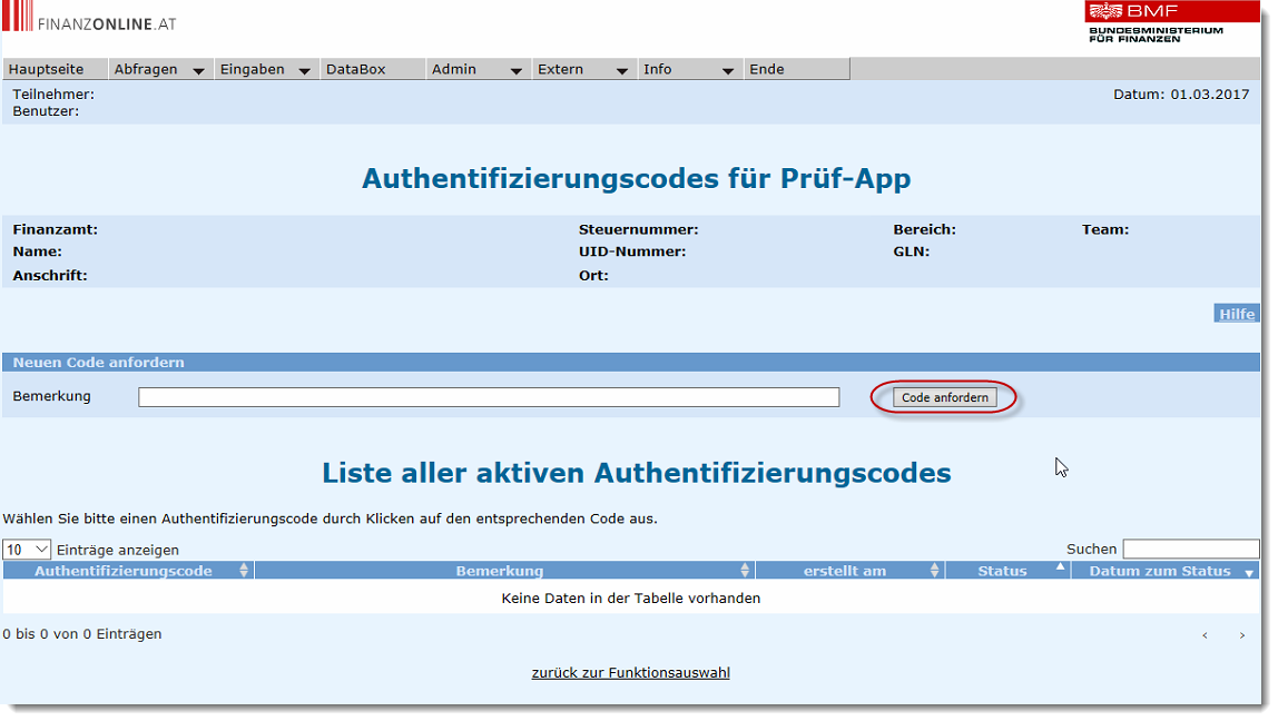 Dort angekommen klicken Sie bitte auf den Menüpunkt "Verwaltung von Authentifizierungscodes für App zur Prüfung der Kassenbelege".