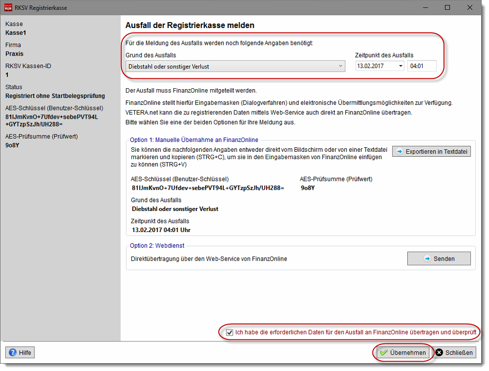 Bestätigen Sie bitte anschließend, Sie die erforderlichen Daten für den Ausfall an FinanzOnline übertragen und überprüft haben, und klicken Sie danach bitte auf "Übernehmen".