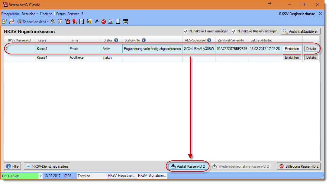 Sie sind verpflichtet, einen Ausfall der Registrierkasse fristgerecht über FinanzOnline an das BMF zu melden. Begeben Sie sich für die Meldung des Ausfalls einer Ihrer Registrierkasse über "Programme --> Buchhaltung" zum Programmteil "RKSV Registrierkassen". Markieren Sie bitte anschließend die Registrierkasse, deren Ausfall Sie melden wollen. Im unteren Bildrand wird daraufhin der Button" Ausfall Kassen-ID..." aktiv und wird von Ihnen bitte angeklickt.