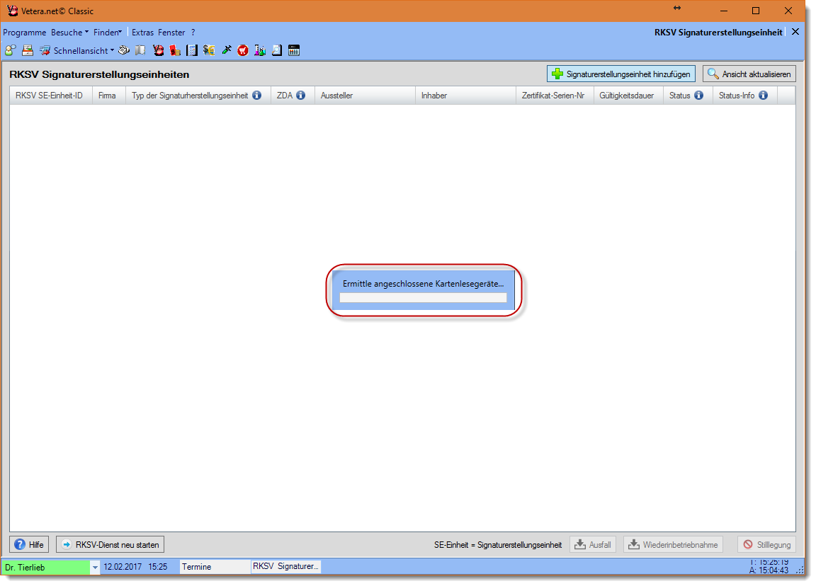 Es werden nun nach dem am Datenbankserver bzw. Hauptrechner angeschlossenen Kartenlesegeräte mit eingesteckter Signaturkarte gesucht.