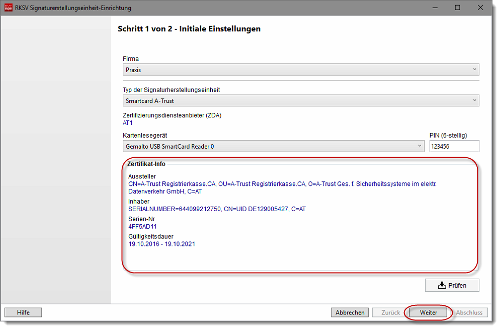 Als Kartenlesegerät wird Ihnen der "Gemalto USB SmartCard Reader 0" angeboten, der an Ihrem Datenbankserver bzw. Hauptrechner angeschlossen ist. Müssen Sie aufgrund unterschiedlicher Firmen mehrere Signaturerstellungseinheiten verwenden, wird Ihnen zusätzlich zum "Gemalto USB SmartCard Reader 0" auch der "Gemalto USB SmartCard Reader 1" etc. angeboten. Die 6-stellige PIN für die Signaturerstellungseinheit erhalten Sie von Ihrem Zertifizierungsanbieter zusammen mit dem Kartenlesegerät und der Signaturkarte. Nachdem Sie Ihre Daten vollständig erfasst haben, klicken Sie bitte auf den Button "Prüfen", damit die Kombination Ihrer Informationen auf Richtigkeit überprüft wird.