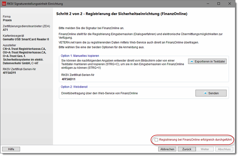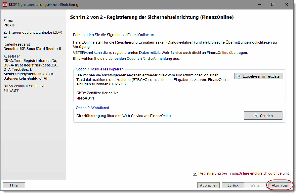 Bestätigen Sie bitte anschließend die Registrierung Ihrer Signaturerstellungseinheit bei FinanzOnline in VETERA.net und klicken Sie danach auf den Button "Abschluss", um die Registrierung vollständig abzuschließen.