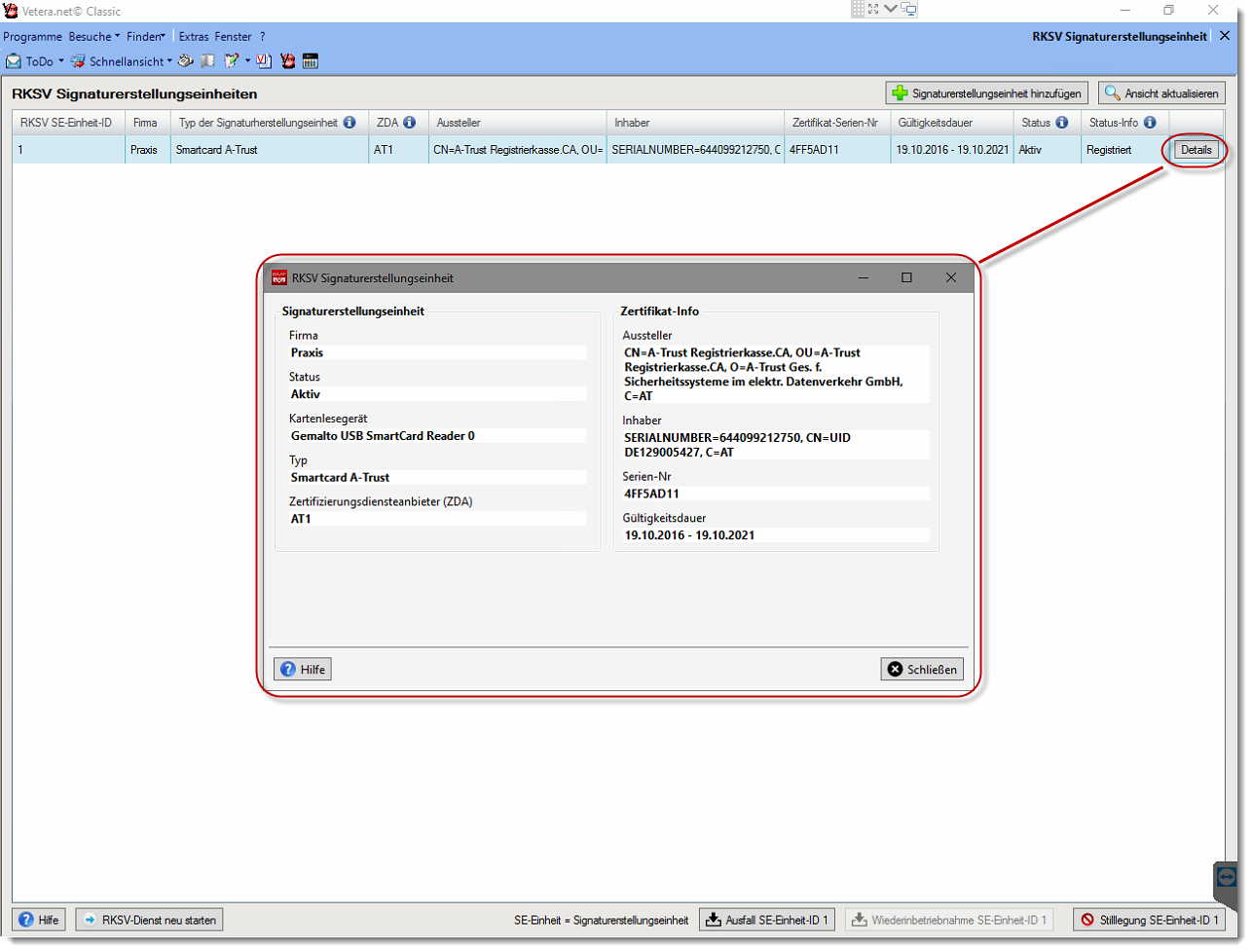 Die aktivierte und registrierte Signaturerstellungseinheit erscheint nun in der Liste der RKSV Signaturerstellungseinheiten. Über den Button "Details" am Ende der jeweiligen Zeile, können Sie alle relevanten Informationen zu dieser Signaturerstellungseinheit einsehen. Wenn Sie aufgrund mehrerer Firmen in Ihrer Klinik oder Praxis weitere Signaturerstellungseinheiten einrichten bzw. registrieren müssen, klicken Sie bitte erneut auf "Signaturerstellungseinheit hinzufügen" und führen Sie die eben genannten Schritte im Registrierungsassistenten erneut durch.