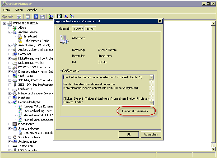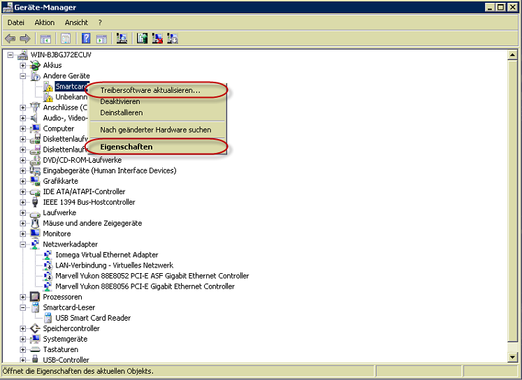 Wählen Sie bitte im Gerätemanager den Eintrag für die SmartCard aus. Dieser Eintrag ist mit einem gelben Ausrufezeichen für ein nicht funktionsbereites Gerät gekennzeichnet. Über einen Rechtsmausklick können Sie im Menü entweder auf "Eigenschaften" oder direkt auf "Treibersoftware aktualisieren..." klicken.