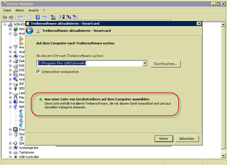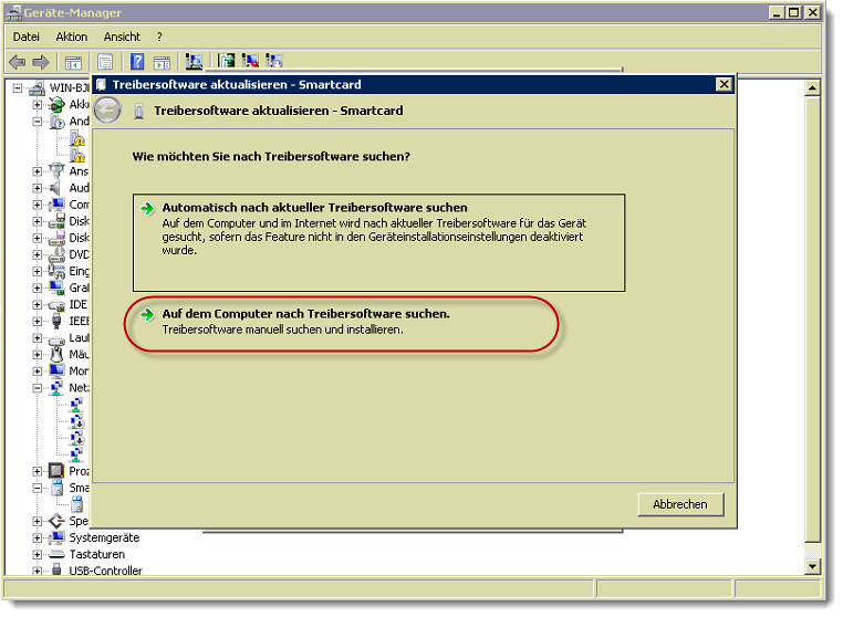 Die Firma Globaltrust hat darauf aufmerksam gemacht, dass es bei den Betriebssystemen Windows 7 und Windows Server 2008R2 dazu kommen kann, dass der Treiber für die SmartCard nicht erkannt wird. In diesem Fall muss der Treiber für die SmartCard im Gerätemanager manuell installiert werden. Gehen Sie bitte dafür wie folgt vor: