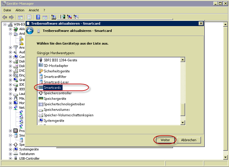 Scrollen Sie in der nachfolgenden Gerätetypenliste bis zum Gerätetyp SmartCards und selektieren diesen Eintrag mit einem Rechtsmausklick. Anschließend klicken Sie bitte auf "Weiter".