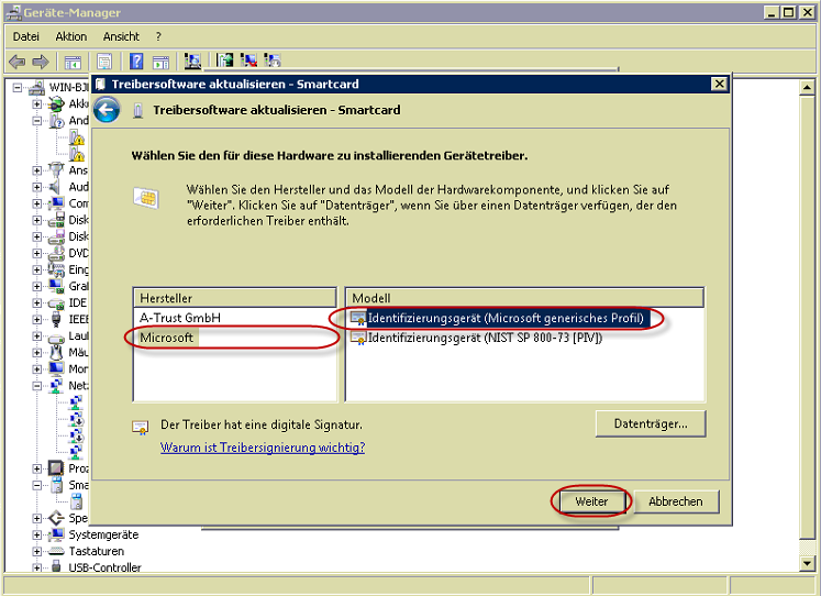 Bei den SmartCards von Globaltrust wählen Sie im nächsten Dialog bitte den Hersteller "Microsoft und das Modell "Identifizierungsgerät (Microsoft generisches Profil)" aus und klicken auf "Weiter".