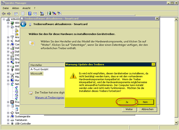 Als nächstes erscheint eine Warnung, in der Sie gefragt werden, ob Sie die Installation dieses Treibers tatsächlich fortsetzen wollen. Dies bestätigen Sie bitte mit "Ja".