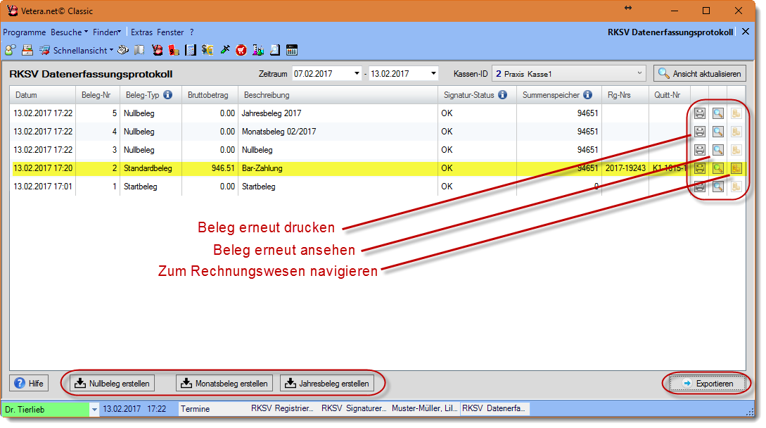 Sollte Ihr Hauptrechner am Monatsende nicht ausgeschaltet sein, erlauben wir uns sicherheitshalber den Monatsbeleg um 23.59 Uhr am jeweils letzten Tag eines Monats zu erstellen und in diesem Zusammenhang auch eine Sicherung des Monatsbelegs unter "DATA/Vetera/Daten/VeteraBackup/RKSV abzulegen. Die Prüfung und ggf. eigenständige Erstellung des Monatsbelegs liegt in Ihrer Verantwortung. Sollte in Ihrer Praxis oder Klinik aufgrund von Notdienstzeiten keine spezifischen Schließzeiten möglich sein, können Sie den Monatsbeleg auch nachträglich (maximal 2 Werktage) erstellen. Fragen Sie bitte hierzu Ihren Steuerberater, wie dies in Ihrem Fall begründet oder dokumentiert werden sollte.