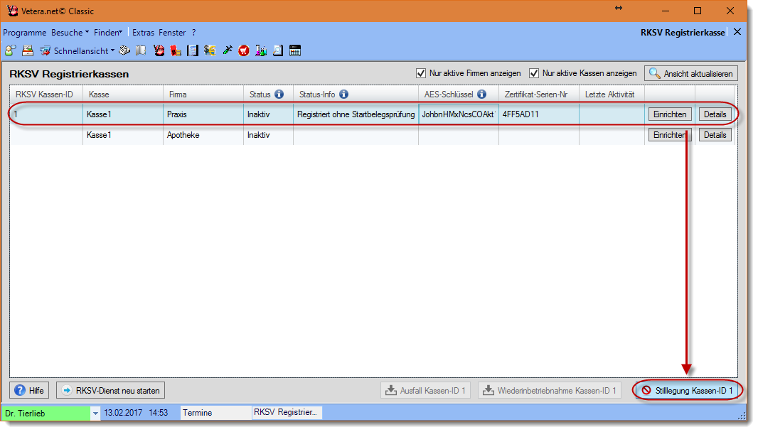 Sie sind verpflichtet, die Stilllegung der Registrierkasse fristgerecht über FinanzOnline an das BMF zu melden. Begeben Sie sich für die Meldung des Ausfalls einer Ihrer Registrierkasse über "Programme --> Buchhaltung" zum Programmteil "RKSV Registrierkassen". Markieren Sie bitte anschließend die Registrierkasse, deren Stilllegung Sie melden wollen. Im unteren Bildrand wird daraufhin der Button" Stillegung Kassen-ID..." aktiv und wird von Ihnen bitte angeklickt.